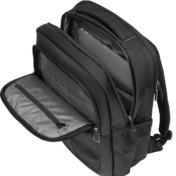 Multi-compartment layout with soft-touch padded sleeve for a laptop or tablet.